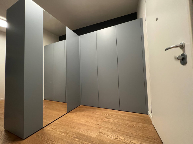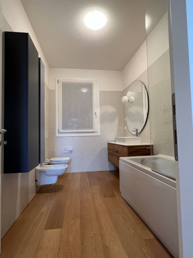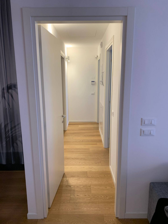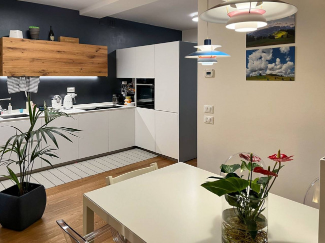 Entrando ci accoglie uno spazioso ingresso e una parete attrezzata lo separa da una grande zona living con cucina a vista arredata con elementi di design, due camere di cui una padronale con bagno dedicato, una doppia e un secondo bagno con vano lavanderia.